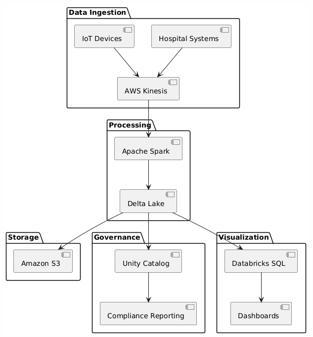 This framework addresses challenges such as fragmented data pipelines, compliance concerns, and the latency of traditional data processing systems. Apache Spark's distributed computing and AWS's robust infrastructure provide scalable, high-performance analytics pipelines. Unity Catalog ensures secure, unified data access, meeting stringent healthcare compliance requirements like HIPAA. For example, patient admission and vital data streaming through Spark’s structured streaming enabled a 40% reduction in hospital response times. With increasing adoption of AI in healthcare, the proposed architecture bridges the gap between raw data ingestion and real-time actionable insights, enhancing patient outcomes.