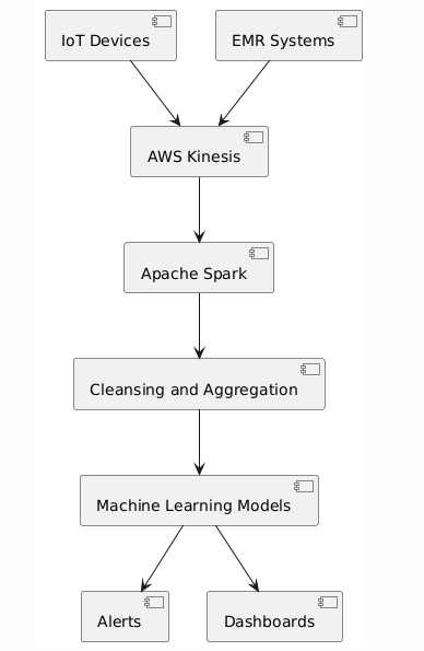 Data Ingestion: Real-time patient monitoring devices and hospital information systems (HIS) generate data streams ingested into the system using AWS Kinesis. This data includes vitals like heart rate, oxygen levels, and other clinical metrics, alongside administrative records.