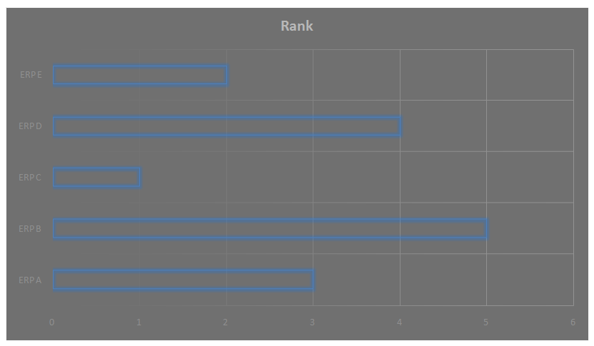 Figure 3 presents the ranking of ERP alternatives based on their overall performance evaluation. ERP C secures the top position (Rank 1), indicating the highest efficiency and effectiveness across key metrics. ERP E follows closely in second place, demonstrating strong operational capabilities. ERP A ranks third, showing competitive performance but slightly lagging behind ERP C and ERP E. ERP D is positioned fourth, reflecting moderate efficiency, while ERP B ranks last (Rank 5), suggesting it is the least favorable option among the evaluated ERP systems. These rankings highlight ERP C as the most optimal choice, with ERP E and ERP A also emerging as strong contenders.