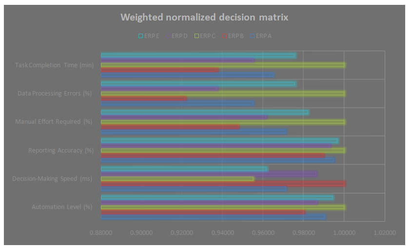 TheWeighted Normalized Decision Matrixin Figure 2 presents the performance scores of different ERP systems across six operational metrics on anormalized scale (0.88 to 1.02). ERP A achieves the highest overall score, particularly excelling in Decision-Making Speed (1.02) and Automation Level (1.00), indicating superior AI-driven efficiency. ERP B follows closely with a Decision-Making Speed of 1.00 and an Automation Level of 0.98. In contrast,ERP E has the lowest values, with a Task Completion Time of 0.89 and a Data Processing Error rate of 0.90, showing a relative performance lag. ERP C and ERP D maintain moderate values across all metrics, with Reporting Accuracy peaking at 0.97 for ERP C and 0.96 for ERP D. The results suggest thatERP A and ERP B outperform others in automation and decision-making speed, making them the most efficient choices.