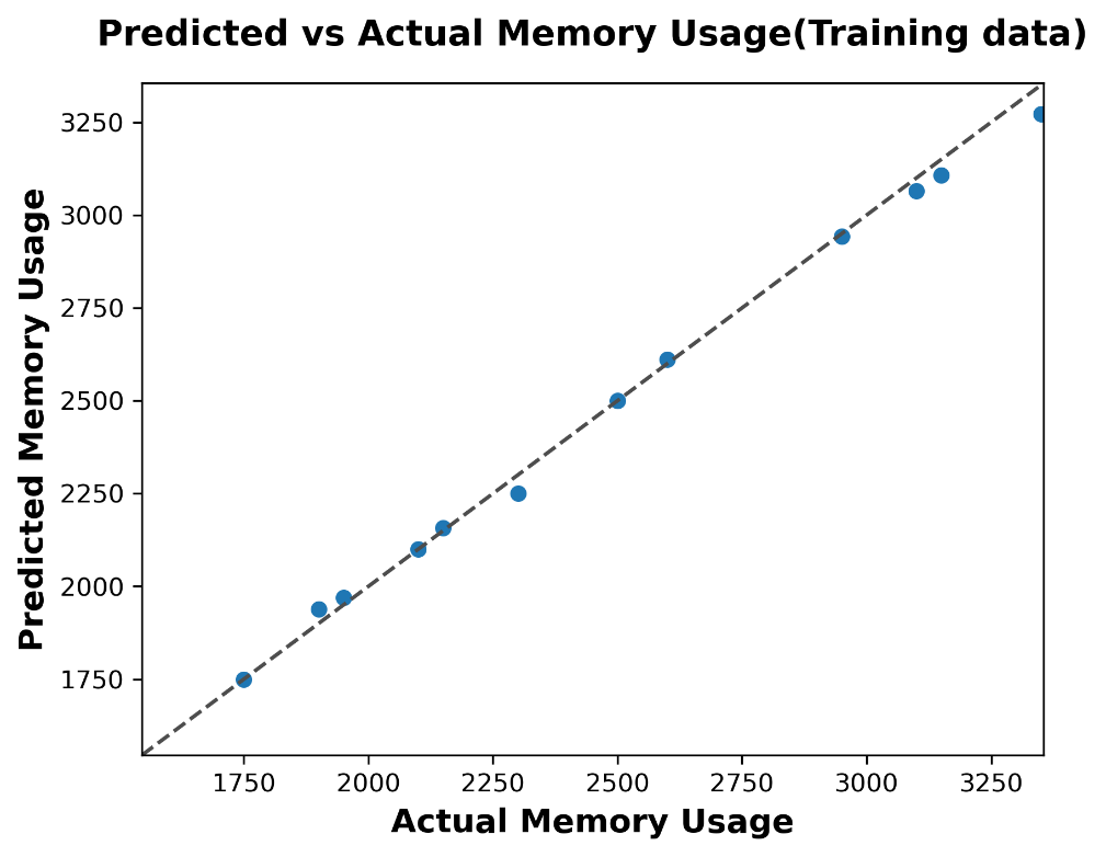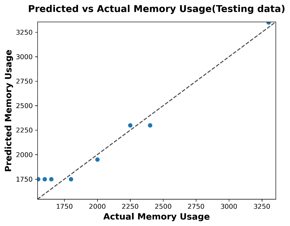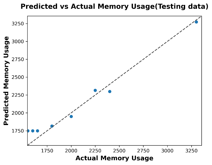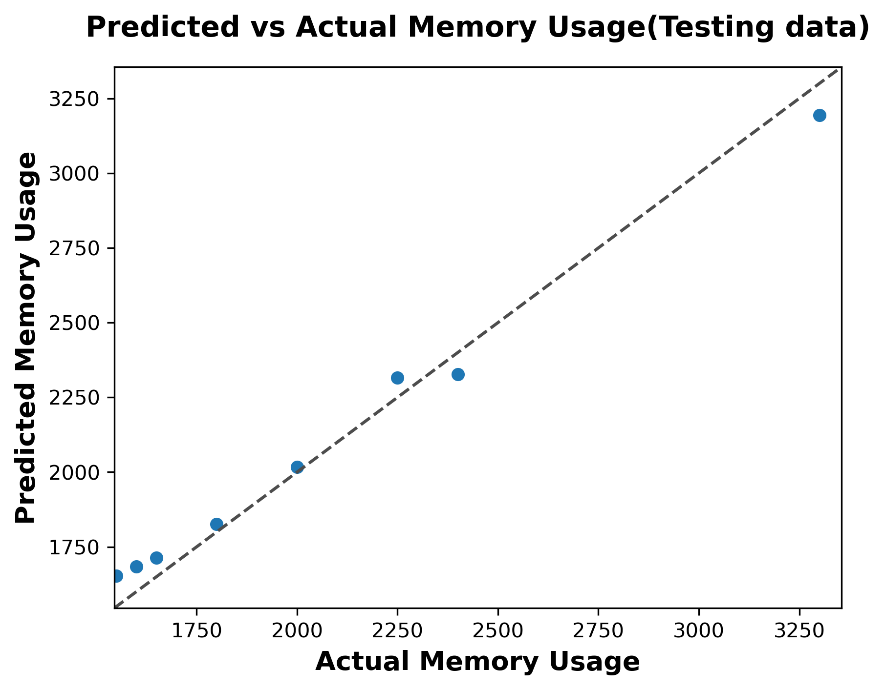 The AdaBoost training results indicate excellent model accuracy, with predicted memory usage values closely matching the actual values along the diagonal reference line. The model performs well over the entire memory usage range (1750–3250 MB), showing minimal deviation from the best predictions.The close clustering of data points near the diagonal indicates both low bias and low variance during training. The clear linear pattern indicates that AdaBoost effectively captured the underlying data structure without any signs of overfitting. Furthermore, the consistent accuracy of the model across varying memory levels reflects a strong understanding of the relationship between input features and memory consumption.