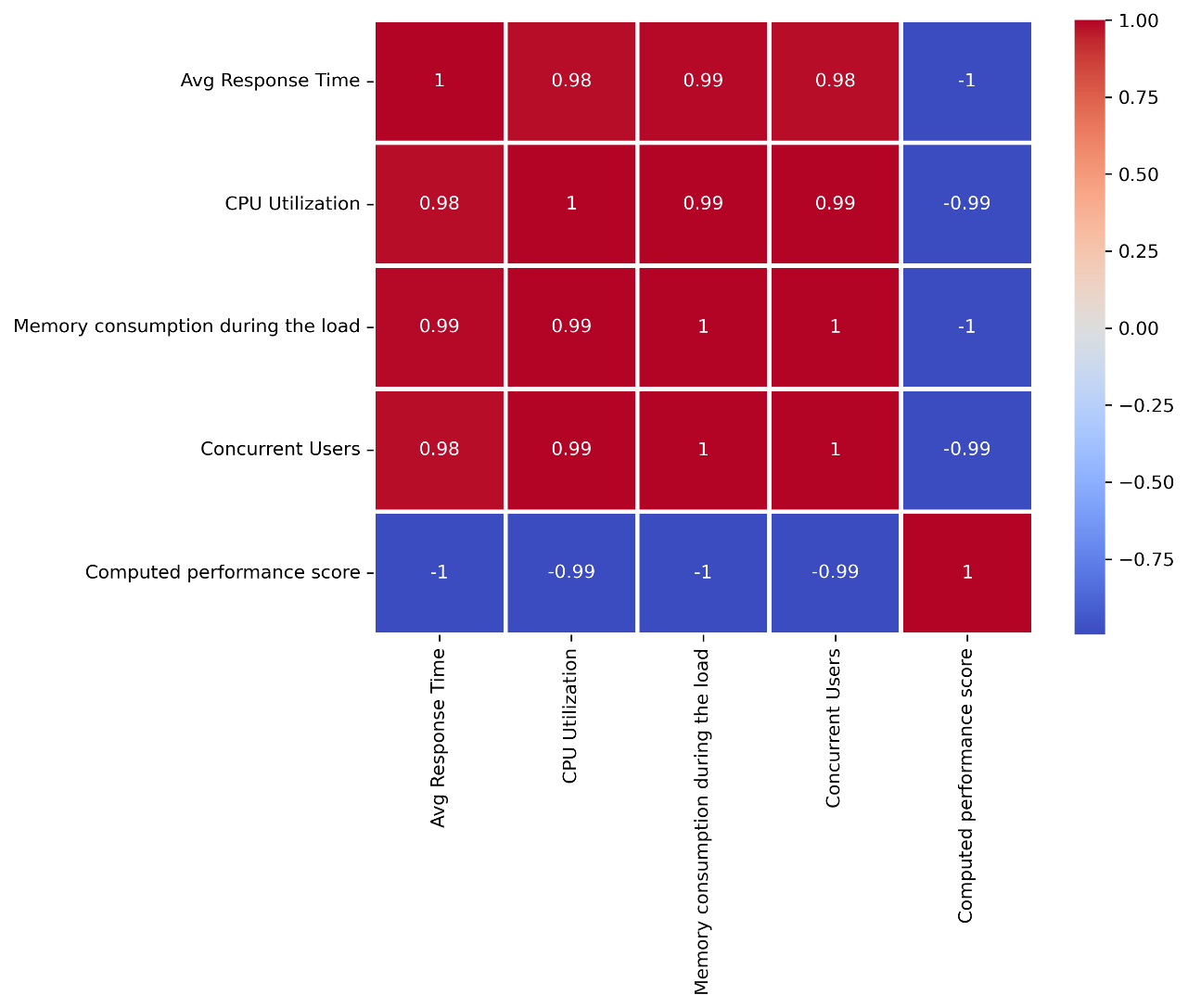 The correlation matrix reveals very strong correlations between the system performance metrics. Response time, CPU utilization, memory consumption, and concurrent user count all exhibit nearly perfect positive correlations (0.98 to 1.00), indicating a high degree of interdependence driven by shared underlying system load factors.In contrast, the performance score is completely negatively correlated with all other metrics (-0.99 to -1.00), clearly demonstrating that it acts as an inverse indicator of overall system health. These patterns highlight memory consumption as a particularly strong predictor of system performance, indicating that resource utilization metrics closely track system degradation under stress.Consistently high correlation values indicate very little data variability or noise, indicating that any single variable can act as a reliable predictor of the others. This makes the dataset well suited for machine learning models aimed at predicting performance outcomes.