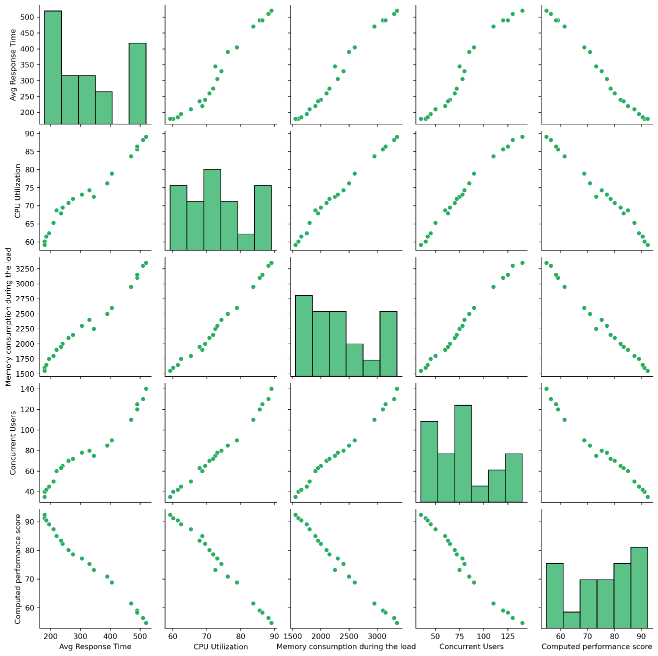 The scatter plot matrix highlights the strong interdependence among key system performance metrics. Variables such as average response time, CPU utilization, memory utilization, and number of concurrent users all show positive correlations, indicating that increasing system load can simultaneously degrade performance across multiple dimensions.The histograms on the diagonal illustrate the distribution of each metric: response time and memory utilization are skewed to the right, indicating occasional high load or stress conditions. In contrast, CPU utilization follows a more normal distribution centered around 70-80%, while the distribution of concurrent users is bimodal, indicating the presence of two distinct load situations or test conditions.The performance score shows a clear negative correlation with the other metrics, confirming that higher response times and resource utilization are associated with lower performance outcomes. The scatter plots also reveal largely linear relationships between the variables, with significant clustering at lower values, which may indicate different system states or phases of testing.