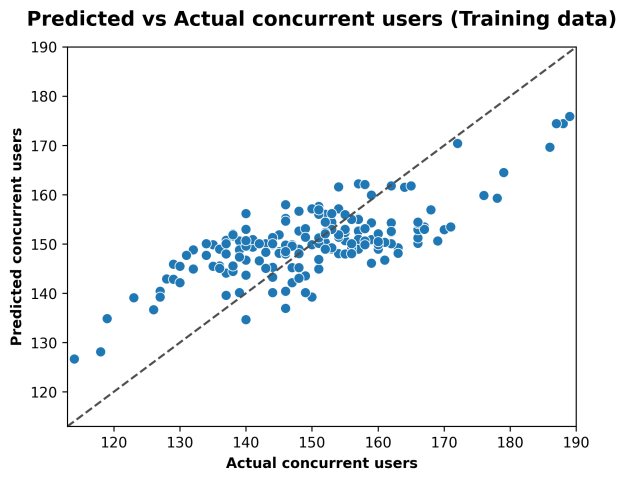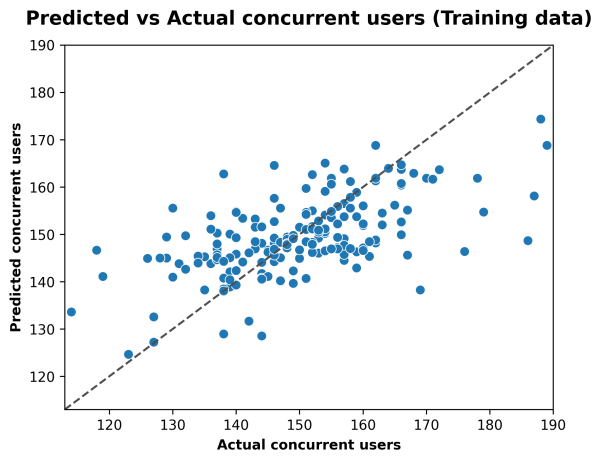 FIGURE 6The Support Vector Regression (SVR) model demonstrates robust predictive capability for concurrent users, as validated by the test data in An R² of 0.473 represents a substantial improvement over linear regression, explaining nearly half the data variance. The model generalizes exceptionally well, evidenced by slightly superior test error metrics (RMSE: 10.139, MAE: 8.672) compared to its training performance. This strong out-of-sample accuracy confirms that SVR effectively captures the underlying non-linear relationships, establishing it as a reliable and superior predictor for forecasting concurrent user loads.