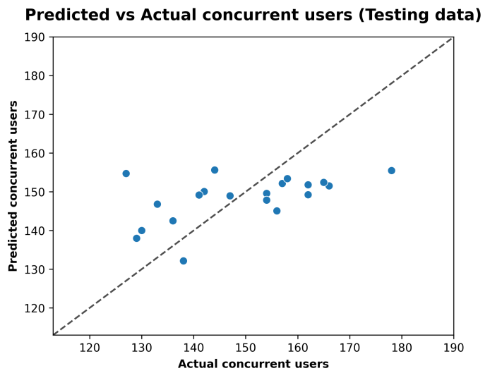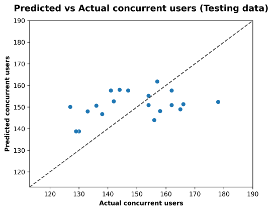 FIGURE 4The linear regression model demonstrates limited efficacy in forecasting concurrent users, as evidenced by the test data With an R² of 0.27, the model explains only a modest portion of the variance in the data. While this test performance is marginally better than on the training set, the persistently high error metrics—including an RMSE of 11.936 and MAE of 10.308—underscore its limited predictive accuracy. This consistent performance across datasets confirms the model's reliable generalization but reveals its fundamental lack of predictive strength, indicating that concurrent user patterns are influenced by complex, non-linear factors not captured by a simple linear approach.