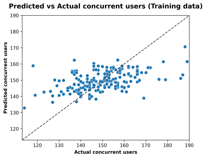FIGURE 3 Based on the training data results shown in the linear regression model demonstrates limited effectiveness in predicting concurrent users. The low R² value of 0.219 suggests that the model accounts for only 21.9% of the variance in the training data. Additionally, the relatively high error values—an RMSE of 11.474 and an MAE of 8.855—indicates notable prediction inaccuracies. Although the similar performance between training and testing datasets implies consistent generalization without over fitting, the overall weak predictive capability suggests that linear regression may be too simplistic to accurately capture this parameter’s behavior.