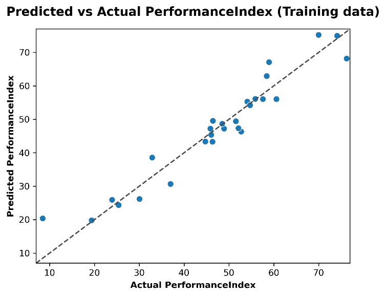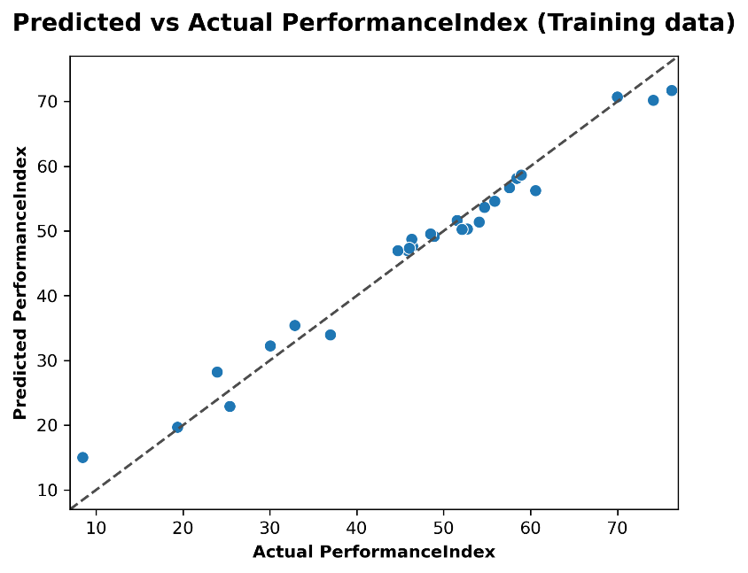 Figure 5 presents a scatter plot comparing the predicted and actual PerformanceIndex values from the training dataset using the Random Forest Regression model. Each blue dot represents a training data instance, where the x-axis denotes the actual PerformanceIndex and the y-axis shows the corresponding predicted value. The dashed diagonal line serves as a reference line indicating perfect prediction i.e., where predicted values exactly match the actual values.From the figure, it is evident that the Random Forest model fits the training data very well. Most of the points lie very close to or directly on the diagonal line, indicating minimal error in predictions. This alignment suggests a high level of accuracy and that the model has successfully captured the underlying patterns in the training dataset. The tight clustering of points around the ideal line across the entire range of PerformanceIndex values from lower to higher also demonstrates the model’s strong capability to generalize within the training set.However, while this near-perfect fit on training data is encouraging, it may also raise concerns about overfittinga common issue with ensemble models like Random Forests. Overfitting occurs when a model learns the training data too well, including noise and outliers, which can negatively impact its ability to generalize to unseen (test) data. Therefore, while Figure 5 confirms excellent training performance, it must be interpreted alongside testing performance metrics to assess the model’s overall reliability and generalization power.