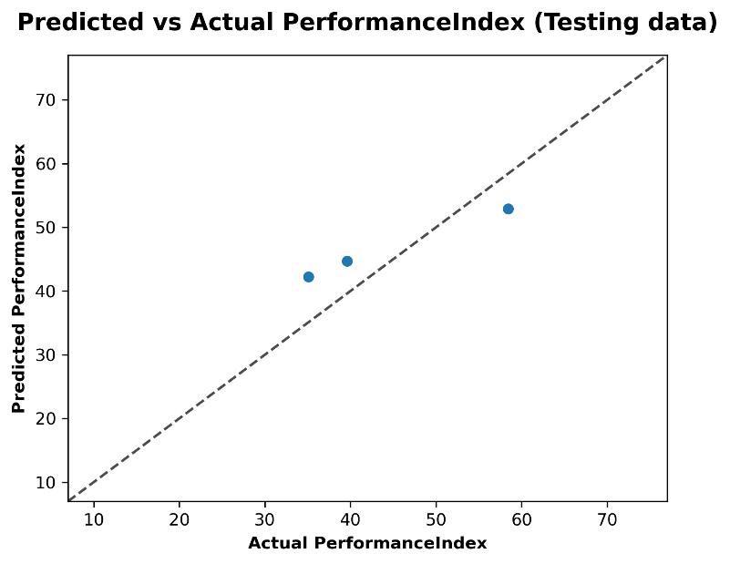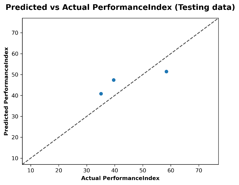 Figure 4 illustrates the performance of the linear regression model by comparing the predicted performance index values from the test dataset with the actual values. The scatterplot has a diagonal dashed line that represents the ideal situation where the predicted values exactly match the actual values (i.e., the equality line, where predicted = actual). Each blue dot in the plot corresponds to a data point from the test dataset, its horizontal position represents the actual performance index and its vertical position shows the predicted value. In this figure, the plotted data points fall relatively close to the diagonal line, indicating that the linear regression model has made reasonably accurate predictions for the performance index. However, there is a significant deviation from the ideal line, indicating some error in the model’s predictions. For example, one point shows a predicted value that is significantly lower than the actual value, while another point is slightly above the diagonal line. These deviations highlight that while the model captures the general trend of the data, it is not completely accurate and can under- or over-predict in some cases. The limited number of data points indicates that the test dataset is small, which may limit the generalizability and robustness of the estimate. In addition, the relatively tight set of points indicates that the model's predictions are consistent, although additional statistical evaluation (such as R² or RMSE) may be necessary to more accurately measure the accuracy of the model.