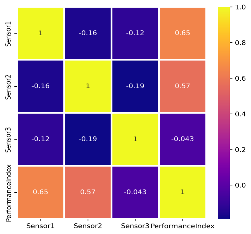 Figure 2 presents a correlation heat map illustrating the relationships between three input variables (Sensor1, Sensor2, Sensor3) and the output variable (performance index). The color scale ranges from –1 to +1, where positive values indicate direct relationships and negative values reflect inverse relationships. The analysis reveals that Sensor1 has a strong positive correlation with the performance index (0.65). This indicates that an increase in Sensor1 measurements is generally associated with improved system performance, making it the most influential parameter. Sensor2 also shows a meaningful positive correlation with the performance index (0.57), indicating its supporting role in improving outcomes. Together, Sensor1 and Sensor2 make a significant contribution to predicting the performance trends of the system. In contrast, Sensor3 shows a negligible correlation with the performance index (–0.043). This indicates that Sensor3 has little or no direct influence on overall performance, or its contribution may be nonlinear and not captured by simple correlations. The weak correlations between sensors (–0.12 to –0.19) indicate that each sensor provides independent information without significant overlap.The heat map highlights Sensor1 and Sensor2 as the main factors determining system performance in artificial intelligence and robotics applications, while Sensor3 plays only a minimal role. This finding reinforces the importance of prioritizing certain inputs for model development and system optimization.